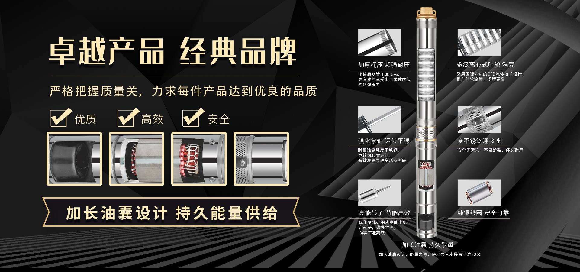 不僅僅是泵,更是流動(dòng)的科技。十多年來,本公司堅(jiān)持走:以質(zhì)量求生存以科技創(chuàng)新求發(fā)展,重合同守信用的道路,生產(chǎn)經(jīng)營(yíng)得到迅速發(fā)展。更希望以后不管從發(fā)達(dá)城市到新農(nóng)村,從工業(yè)制造到尖端科技產(chǎn)業(yè)都隨處可見創(chuàng)江井泵的身影,創(chuàng)江深井泵已成為干萬用戶心目中優(yōu)質(zhì)和信心的保證我們將以優(yōu)質(zhì)的產(chǎn)品和最完善的售后服務(wù)來真誠與各界朋友開展廣泛的合作,共同創(chuàng)造一個(gè)美好的未來!